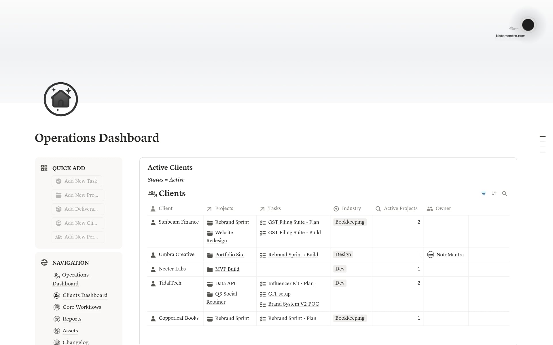 Agency Operations OS consolidates the whole client-delivery operation into one Notion workspace. Clients, projects, tasks, deliverables, SLAs, team capacity, client portals, financials. Ten connected databases with formulas and rollups that surface what is due, what is late, and where you are making money.